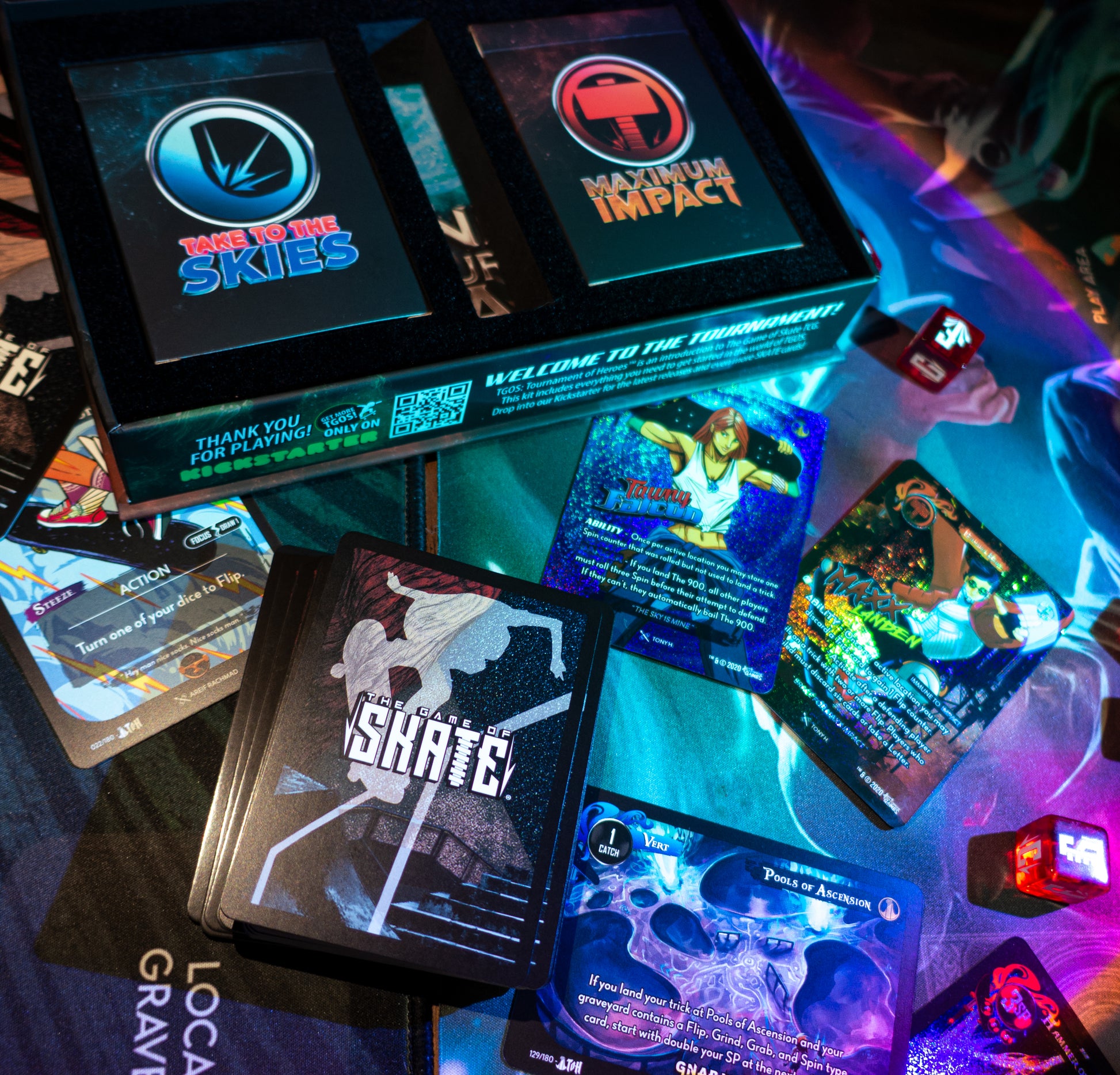If you've ever played a game of H.O.R.S.E. on a basketball court, then you already know how to win at The Game of Skate! Play skateboard trick cards and roll the dice to land them! Players take turns trying not to fall and bail on their opponent's tricks or you risk taking a letter. The first person to spell SKATE is knocked out of the game!